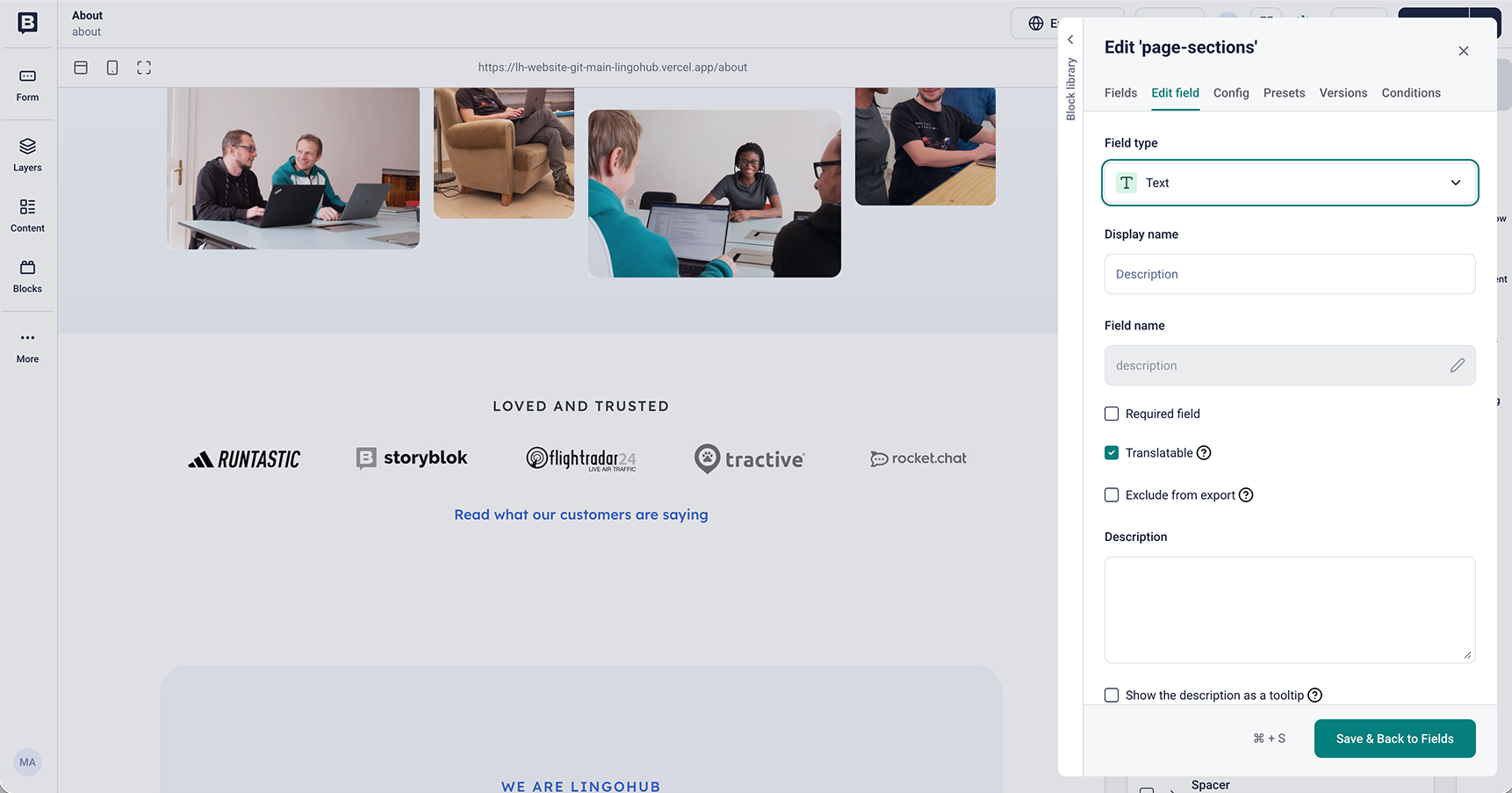 Before translation can begin, Storyblok needs to be set up correctly. In Storyblok, content is organized into blocks and fields. Blocks define reusable components such as sliders, teasers, or text sections, while each block contains individual fields like headlines, body copy, or CTA labels. Any field that should be translated must be marked as translatable, and the required target languages need to be configured in Storyblok’s internationalization settings.