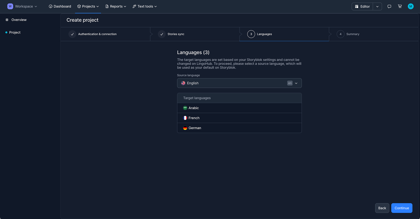 In the next step, the source language and the target language(s) are directly taken from the language configuration already defined in Storyblok or manually selected.