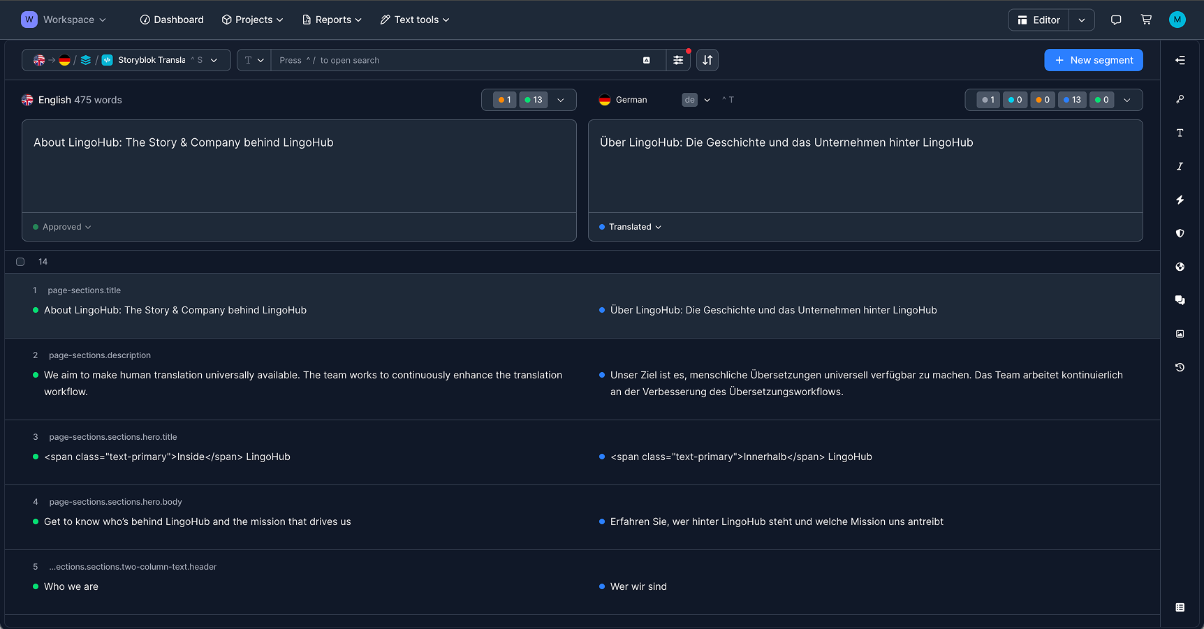 From there, translators and reviewers work in LingoHub’s editor with the source and target content side by side, while Storyblok field keys remain visible in the background. Headlines, body copy, CTA labels, and even inline markup stay connected to their original position in the content model, which makes review more reliable and reduces the risk of missing individual elements.