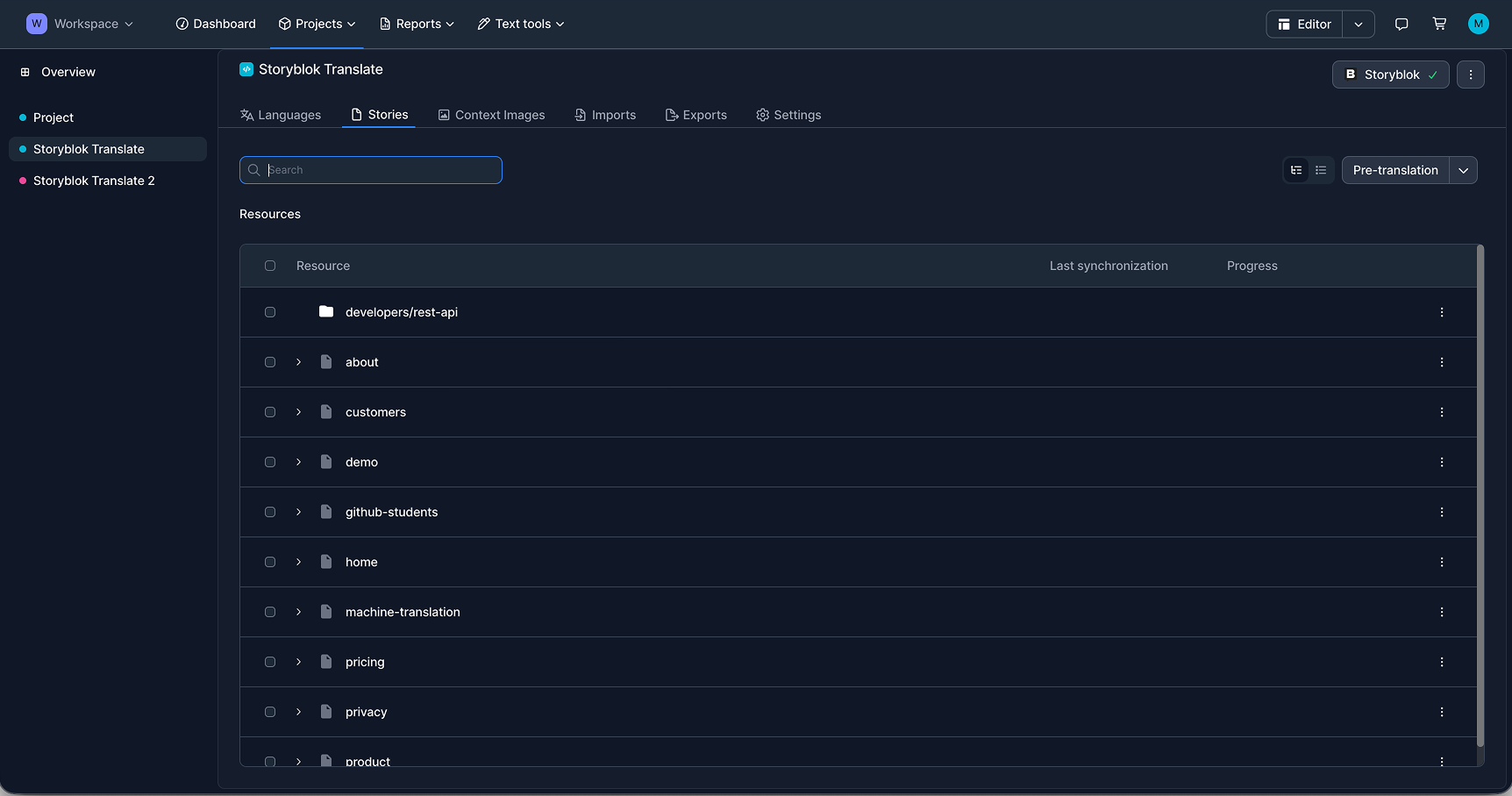 Once the project is configured, LingoHub automatically syncs the selected Storyblok resources and prepares them for translation while preserving the original JSON-based field structure. Instead of flattening content into disconnected strings, the imported content remains organized by story, field, and segment, making it much easier to manage structured localization at scale.