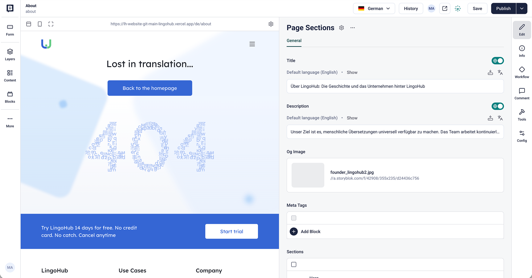Instead of localizing disconnected text fragments, teams can translate Storyblok content within its intended structure, with clear relationships between every element. Headlines stay where they belong, buttons remain connected to the right flow, and product messaging stays in its place within the larger content model. At the same time, LingoHub helps maintain context, terminology, and brand voice through features like glossaries and style guides, so translations stay aligned editorially.