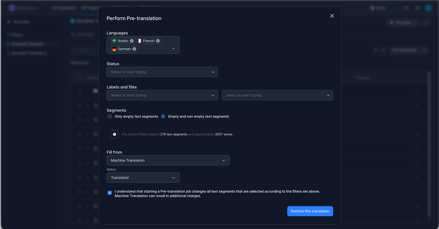After synchronization, teams can start translation directly in LingoHub. Pre-translation can be used to select target languages, define which segments should be included, and fill them automatically with machine translation or AI translation as a first step.