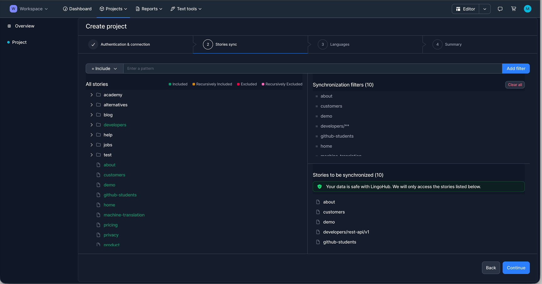 From there, they define which stories should be synchronized by using filters, so only the relevant content is included in the project.